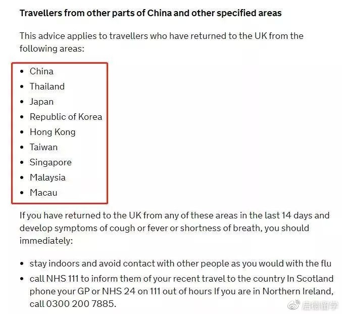 "任何入境英国的旅客,在过去14天内从中国(包括中国香港,中国澳门、中国台湾)、日本、泰国、韩国、新加坡、和马来西亚回来后出现咳嗽,发烧或呼吸急促的症状,应自我隔离观察,并马上致电NHS 111。”