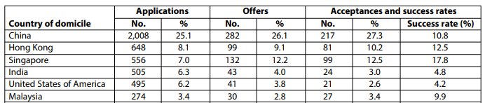 数据解读:纵向分析近两年中国学生申请剑桥大学的数据,可以总结出一样的趋势,申请人数在逐年增加,但是录取率确实明显下降,这对中国申请者提出更高的挑战,申请剑桥大学的中国学生需要全面提升竞争力。从整体数据我们可以看出中国依然稳居申请剑桥大学国际生首位。