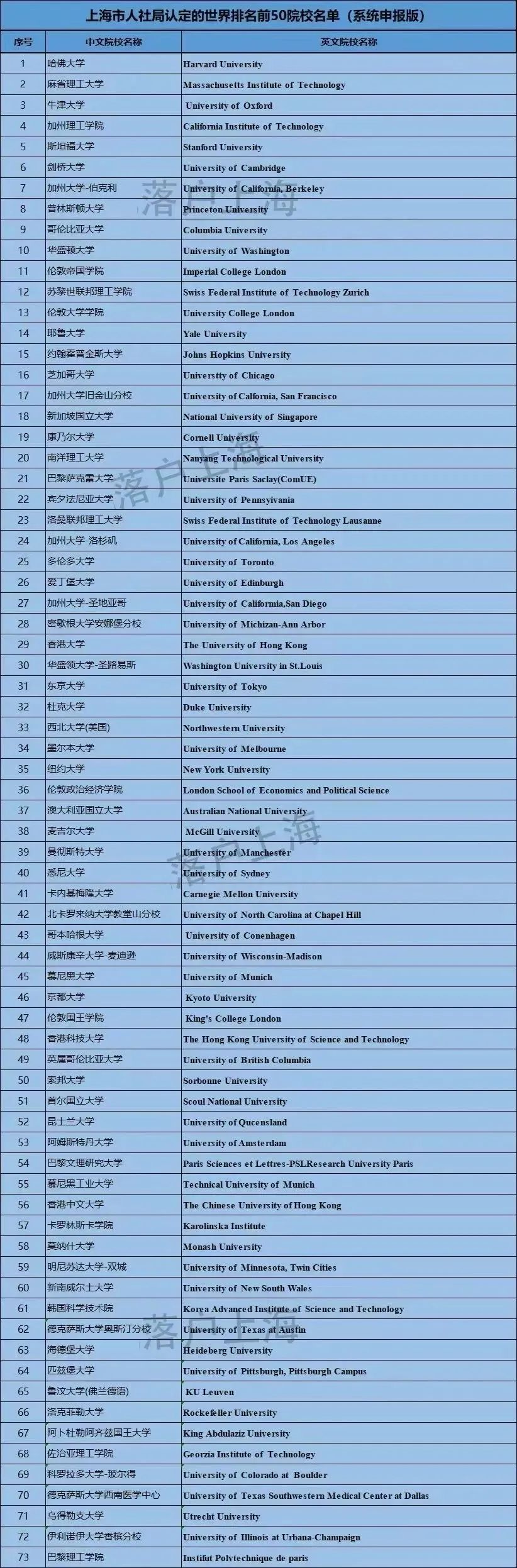 名单中,上海人社局认定的世界前50院校名单,共有73所院校,从这些院校毕业的留学生,没有要求,来沪全职工作,符合留学生落户的基础条件就可以直接落户上海!