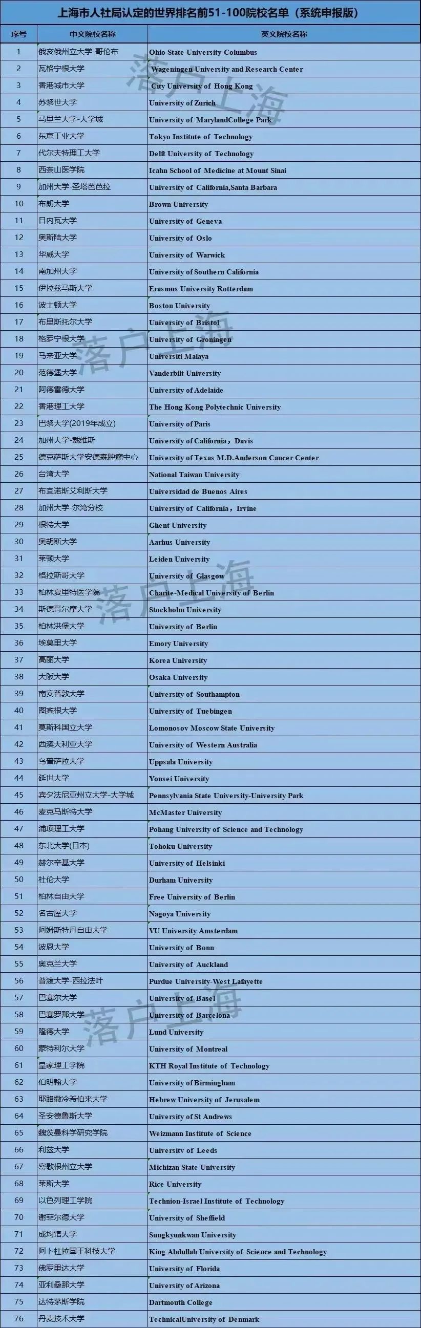 上海人社局认定的世界前51-100院校名单,共有76所院校,从这些院校毕业的留学生,来沪全职工作,符合留学生落户的基础条件,缴纳6个月社保就能落户!没有社保基数和工作要求!