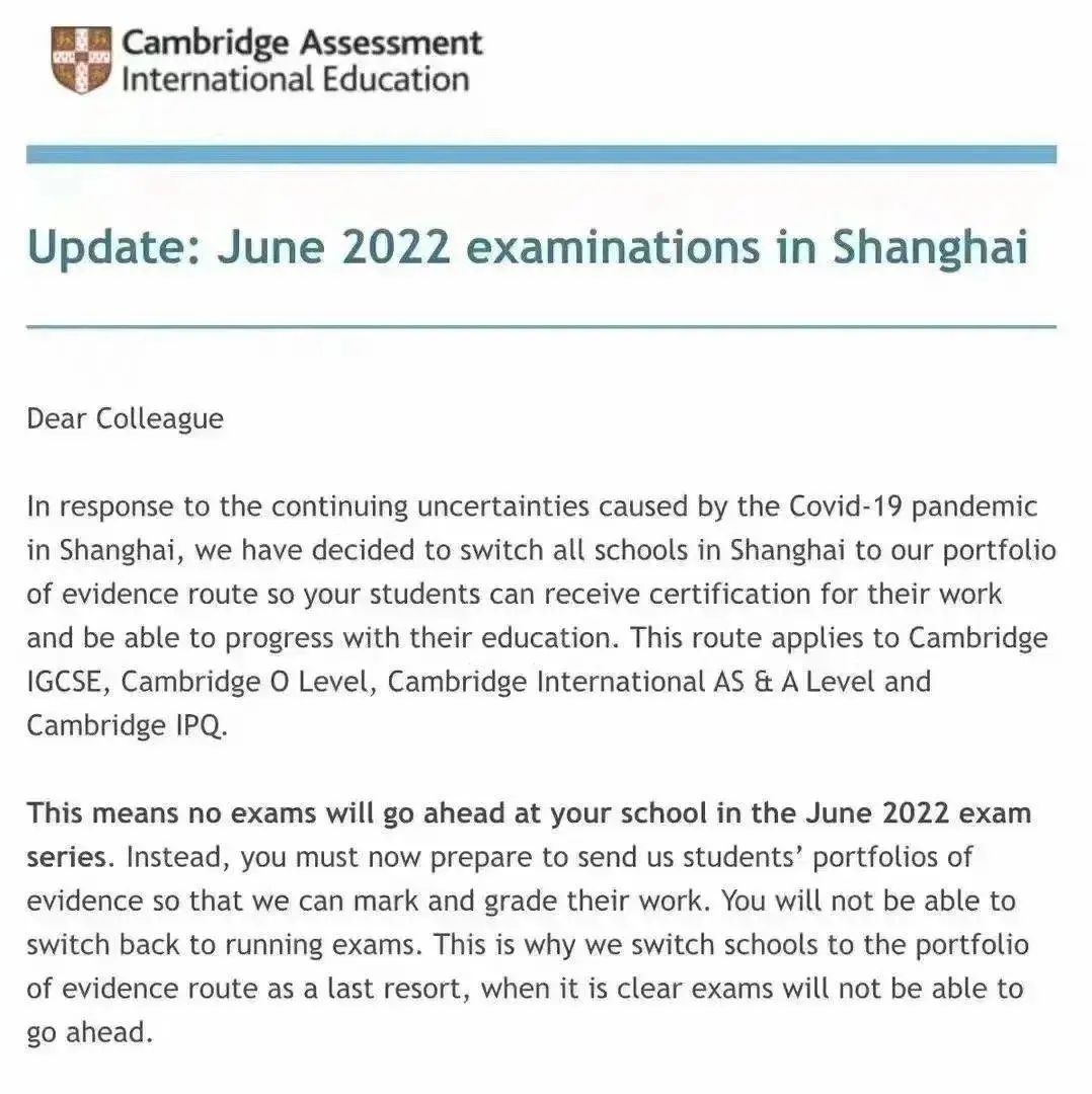 A-Level / IGCSE CAIE、Edexcel和AQA三大考试局宣布原定5月的A-level 和IGCSE 的考试在上海及部分城市取消,但会用其他评估方式替代,详情请参考各考试局的通知。英国院校去年已经接受过评估的成绩,所以申请英国大学的同学基本不受影响。 AP 5月初美国大学理事会由于疫情的原因上海,北京,苏州,南昌,哈尔滨等城市取消AP 考试, 由于疫情较为复杂,大学理事会决定不提供补考,不能参加考试的考生须明年再次参加考试。 IB 国际文凭组织宣布华东地区取消IB考试,城市包括上海,浙江,江苏和安徽,这些城市的学生可以用预估分和平时成绩的方式递交预估成绩,评估方式和去年一样。国际文凭组织会为会员学校提供进一步信息和支持。