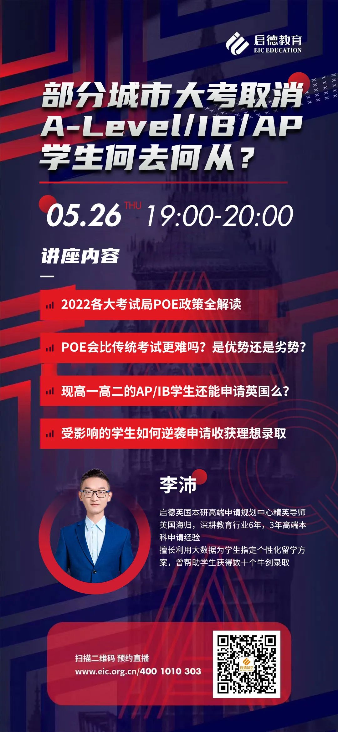 5月26日19:00《部分城市大考取消,A-Level/IB/AP学生何去何从》线上讲座,启德英国本研高端规划申请中心精英导师李沛老师为你现场讲解!